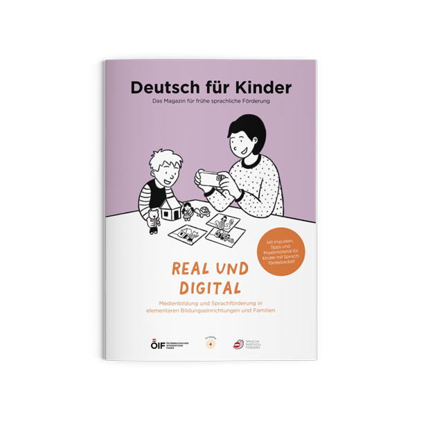 „Real & Digital“, Ausgabe 4Die Ausgabe 4 ist dem Thema Sprachförderung und Medienbildung gewidmet und gemeinsam mit der PH Oberösterreich und dem Wiener Bildungsserver entstanden. Es dreht sich alles um die Vermittlung von Medienkompetenz in der elementarpädagogischen Praxis und in Familien. Neben Tipps im Umgang mit digitalen Medien für Fachkräfte und für Eltern beinhaltet es auch mehrsprachige Audiofiles und Praxismaterialien.
